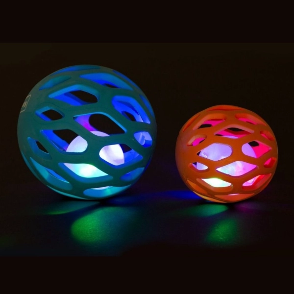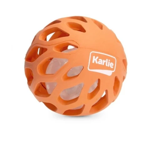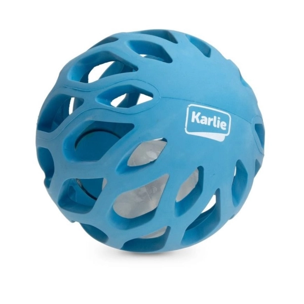 Karlie gumová hračka je robustná deravá gumová guľa s menšou svetielkujúcou guličkou uprostred. Hračka je odolná ale mäkká, pri hre sa sama rozbliká. Vďaka tomu si váš psík užije aj hru v tme.
