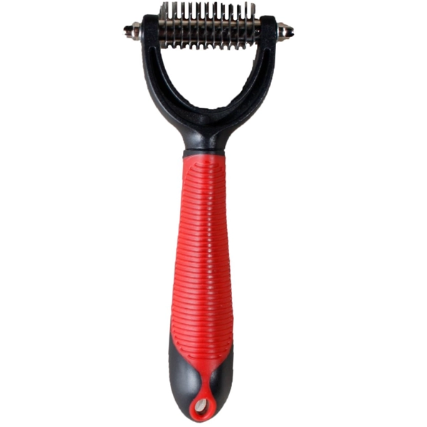 odstrániťKarlie vyčesávacie hrablo s kovovou hlavicou osadenou 12 zubami je ideálne na prečesanie a preriedenie vrchnej srsti, odstránenie odumretých chlpov hladkosrstých plemien a plemien s priliehavou srsťou. Hrablo je podobné trimovaciemu nožu, je však efektívnejšie.