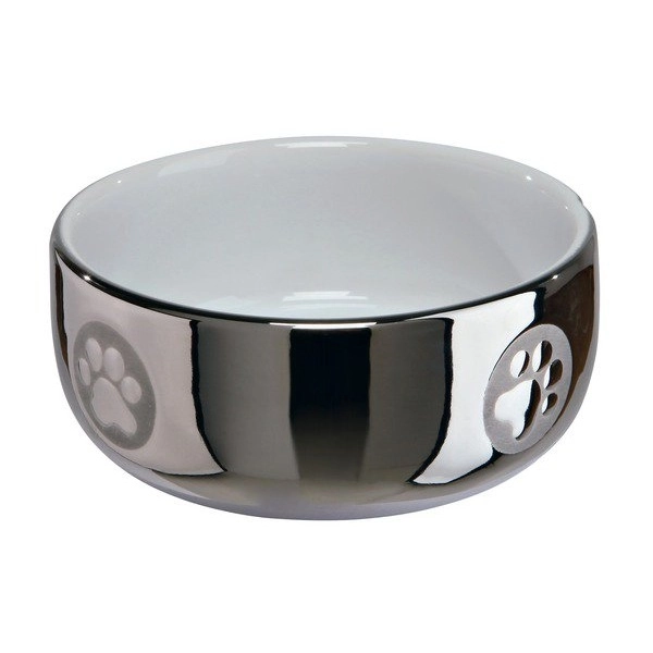 Krásna, elegantná a praktická - keramická miska pre mačky s kvalitnou glazúrou v striebornej farbe. Zvonku je zdobená vzormi mačacích paciček. Vnútri je miska biela.