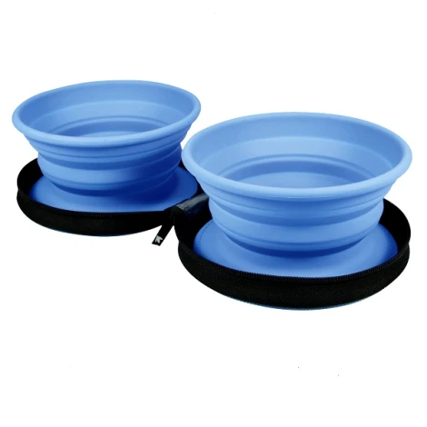 Cestovná miska pozostávajúca z dvoch silikónových misiek, ktoré zaujmú svojou vysokou kvalitou. Obe misky pojmú až 350 ml a sú skvelé na poskytovanie potravy a vody pre vášho domáceho miláčika na cestách. Moderný dizajn si zamiluje nejeden majiteľ domáceho maznáčika. Misky sú k puzdru pripevnené pomocou suchého zipsu a puzdro je vybavené kvalitným a odolným zipsom.