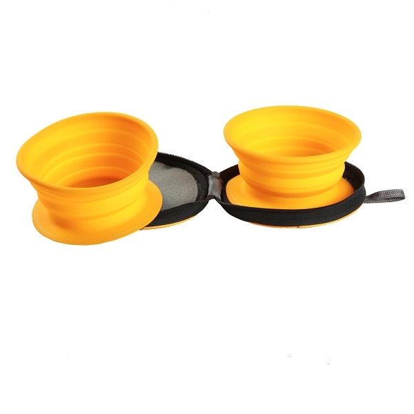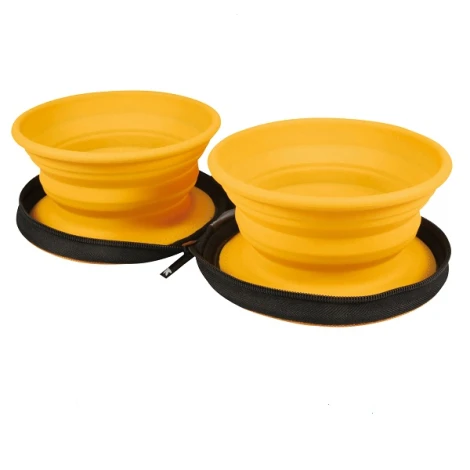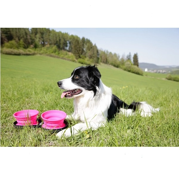 Cestovná miska pozostávajúca z dvoch silikónových misiek, ktoré zaujmú svojou vysokou kvalitou. Obe misky pojmú až 350 ml a sú skvelé na poskytovanie potravy a vody pre vášho domáceho miláčika na cestách. Moderný dizajn si zamiluje nejeden majiteľ domáceho maznáčika. Misky sú k puzdru pripevnené pomocou suchého zipsu a puzdro je vybavené kvalitným a odolným zipsom.