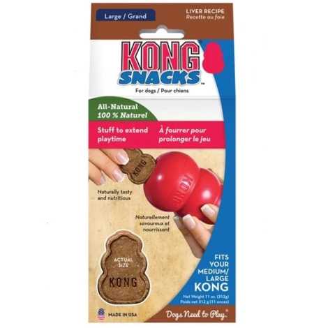 Kong Snack Liver maškrta do hračiek Kong veľkosti L. Lahodné a chrumkavé maškrty Liver z kuracej pečene sú vďaka svojim rozmerom vhodné ako náplň do väčších gumových hračiek Kong veľkosti L a XL. Výrobok neobsahuje kukuricu a sóju.