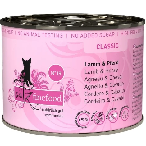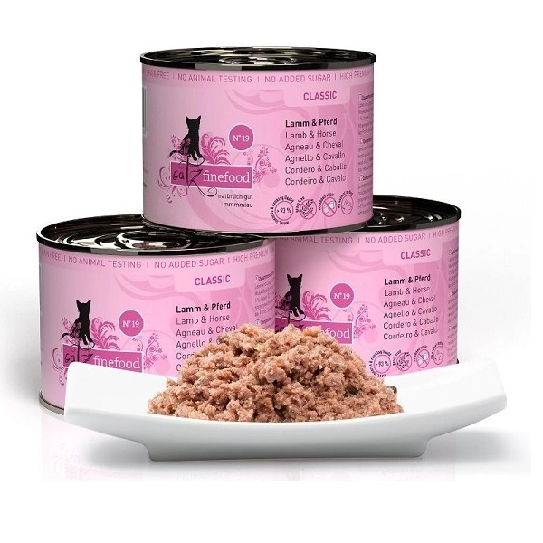Lahodná konzerva Catz finefood pre mačky, ktorá obsahuje vysoký podiel jahňacieho a konského mäsa, zdraviu prospešné paradajky a zázvor.