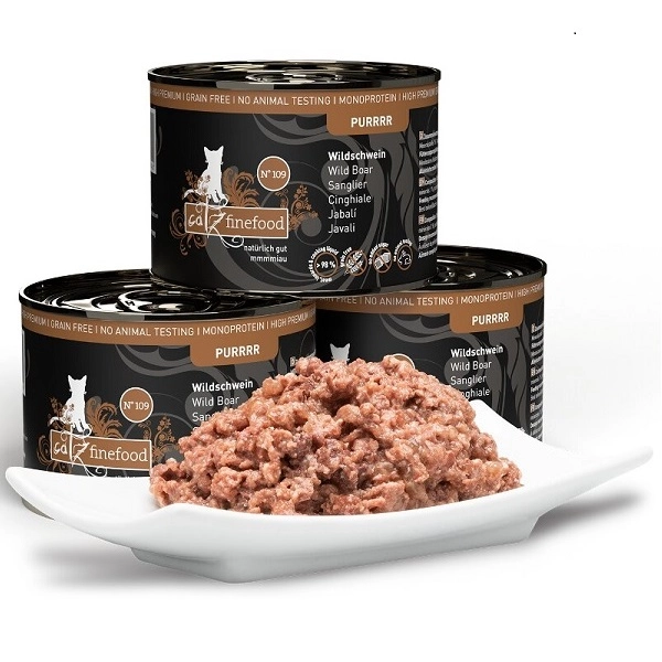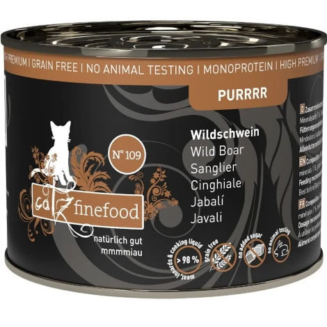 Konzerva CF Purr No. 109 s diviačím mäsom 200 g. Zdravé šťavnaté krmivo pre mačky, ktoré obsahuje vysoký podiel mäsa v potravinárskej kvalite. Hlavnou zložkou je mäso a vhodné vnútornosti. Bez obilnín.