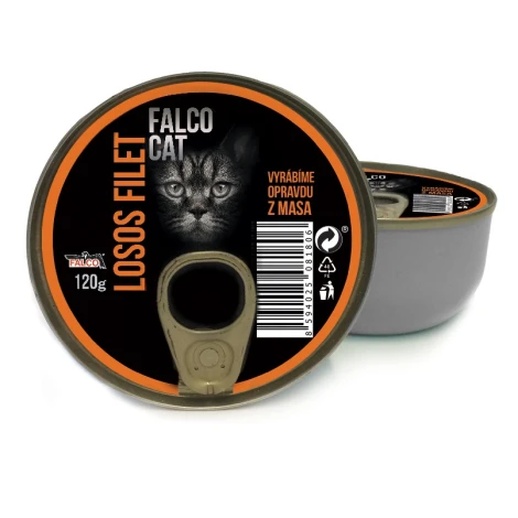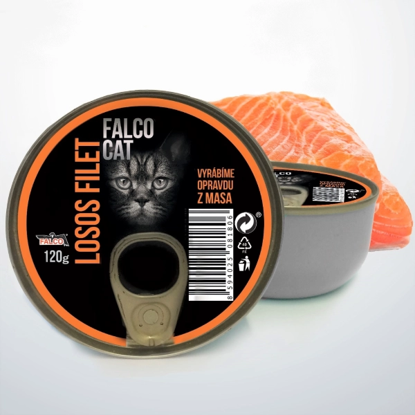 Luxusná, ručne plnená konzerva Falco Cat pre malé pôžiťkárov. Obsahuje iba celé a vybrané filety mäsa, konkrétne z lososov. Úplne prírodný produkt bez ryže a zeleniny. Miestom vzniku konzerv Falco je Česká republika.