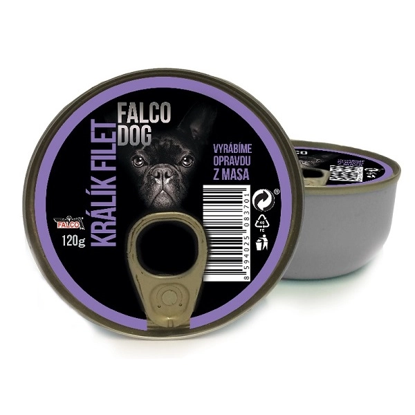 Falco Dog je rad mäsových konzerv obsahujúcich 100 % filety. Mäsové konzervy sa plnia ručne, aby sa zabezpečila najvyššia kvalita, a len vybraným svalovým mäsom bez pridania ryže, zeleniny alebo zemiakov. Falco Dog je úplne bez farbív, aróm, sóje a chemických látok. Najlepší kus mäsa, aký si váš domáci miláčik zaslúži!