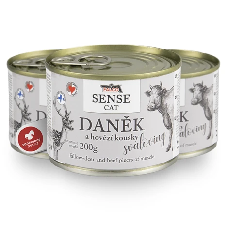 Mäsová konzerva pre mačky všetkých vekových kategórií a plemien Falco Sense. Receptúra obsahuje mleté mäso, kúsky svaloviny a je bez obsahu vnútorností. Vyrobené v ČR.