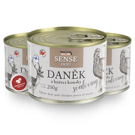 Masová konzerva pre psy všetkých vekových kategórií a plemien Falco Sense. Receptúra obsahuje mleté mäso, kúsky svaloviny a je bez obsahu vnútorností. Vyrobené v ČR.
