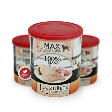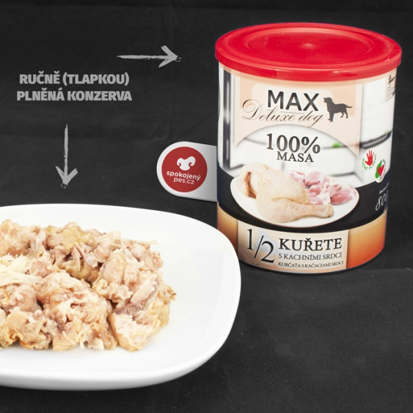 Jedinečné české konzervy Max obsahujú polovicu kurčaťa nasekaného na kúsky spoločne s kačacím srdci. 100 % obsah mäsa a kostí, bez chemických prísad, náhrad a plnidiel. Vhodné pre psov každého veku. Najlepšie mäsko, ktoré môžete svojmu psovi dať.