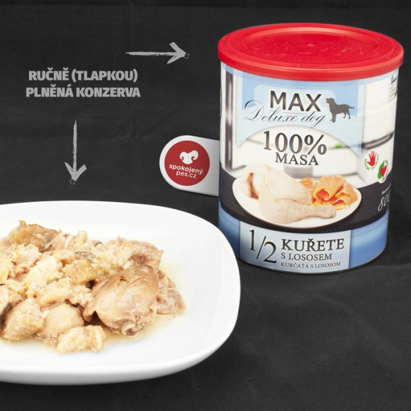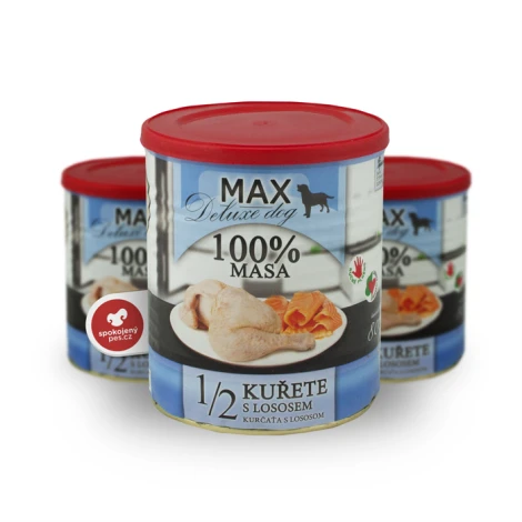 Mäso 100 % (kurací štvrtky 75 %, losos 25 %).
