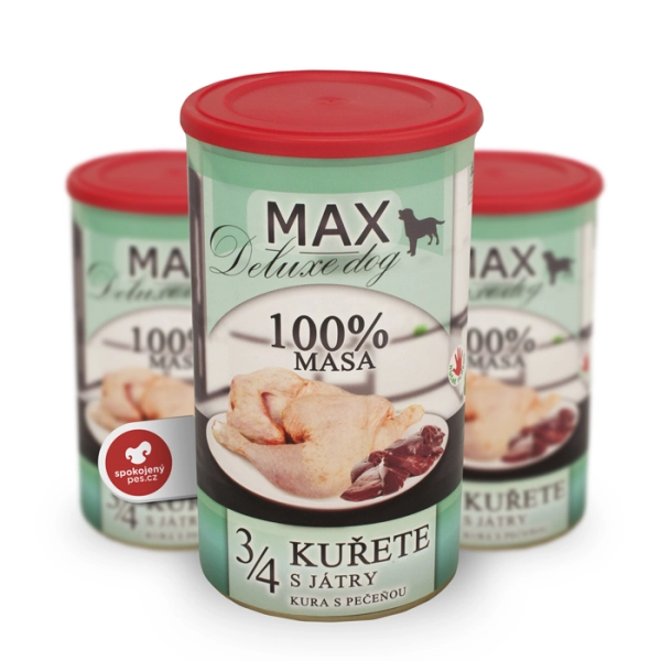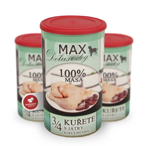 Jedinečné české konzervy Max obsahujú 3/4 kurčaťa a pečeň narezané na kúsky. 100 % obsah mäsa a kostí, bez chemických prísad, náhrad a plnidiel. Vhodné pre psov každého veku. Najlepšie mäsko, ktoré môžete svojmu psovi dať.
