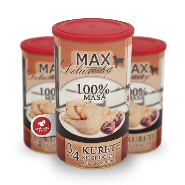 Jedinečné české konzervy Max obsahujú 3/4 kurčaťa a srdce narezané na kúsky. 100 % obsah mäsa, bez chemických prísad, náhrad a plnidiel. Vhodné pre psov každého veku. Najlepšie mäsko, ktoré môžete svojmu psovi dať.