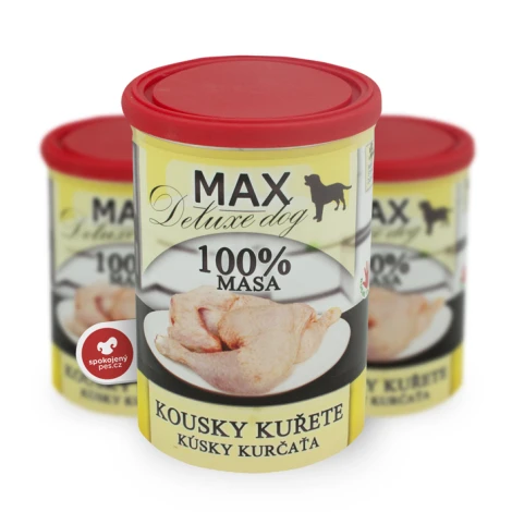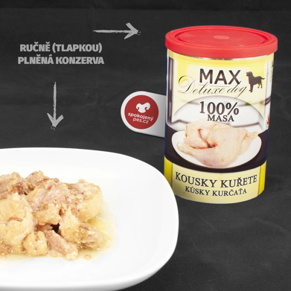 Jedinečné české konzervy Max obsahujú kuracie mäso nasekané na kúsky. 100% obsah mäsa, bez chemických prísad, náhrad a plnidiel. Vhodné pre psov každého veku. Najlepšie mäsko, ktoré môžete svojmu psovi dať.
