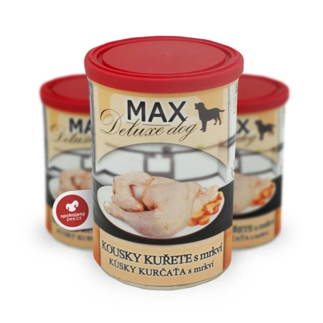 Jedinečné české konzervy Max obsahujú kúsky jemného kuracieho mäsa doplneného mrkvou. 100 % obsah mäsa, bez chemických prísad, náhrad a plnidiel. Vhodné pre psov každého veku. Najlepšie mäsko, ktoré môžete svojmu psovi dať.
