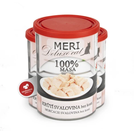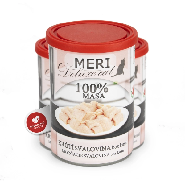 Česká, ručne plnená konzerva Meri Cat Deluxe pre mačky. Obsahuje iba 100 % morčacieho mäsa bez kosti. Kusy mäsa sú mäkké, prirodzene konzervované, úplne bez chemických aditív. Lahodná mäsová potrava, ktorú si vaša mačka zamiluje.