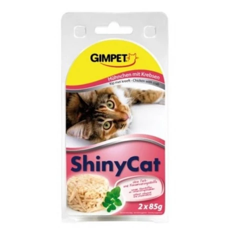 Dve konzervičky superprémiového krmiva pre mačky Shiny Cat. Receptúru s kúskami kurčaťa a krabom si zamiluje aj ten najmaškrtnejší mačací jazýček. Bez umelých prísad a konzervačných látok. Obsahuje tie najdôležiťejšie vitamíny, minerálne látky, tuky a aminokyseliny.