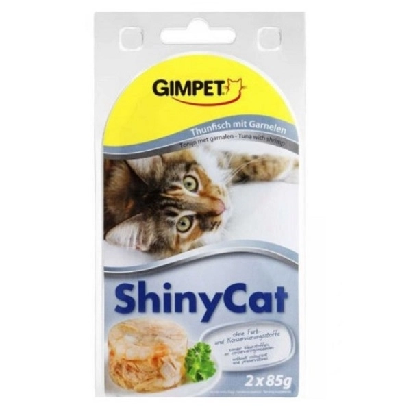Dve konzervičky superprémiového krmiva pre mačky Shiny Cat. Receptúru s kúskami tuniaka a krevetami si zamiluje aj ten najmaškrtnejší mačací jazýček. Bez umelých prísad a konzervačných látok. Obsahuje tie najdôležiťejšie vitamíny, minerálne látky, tuky a aminokyseliny.