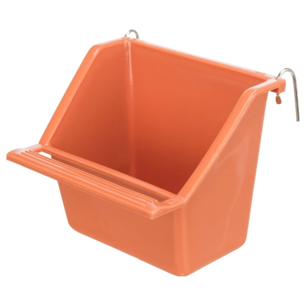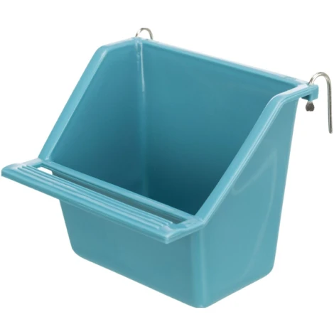Pestrofarebné krmítko so širším schodíkom pre pohodlné kŕmenie. Zadná stena je extrémne vysoká, v zadnej časti kŕmidlá sú kovové háčiky pre jednoduchú inštaláciu do klietky.
