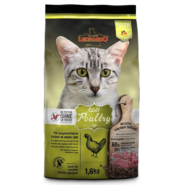 Kvalitné bezobilné krmivo LEONARDO pre mačky od 1 roku veku. Alternatívne výživa pre mačky citlivé na lepok alebo obilniny, 52% obsahu tvorí mäso.