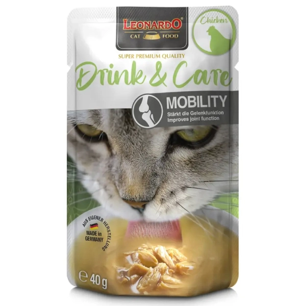 Drink & Care Mobility by Leonardo s jemným kuracím mäsom a kolagénom je lahodný vývar, ktorý podporuje zdravé kĺby a ladný krok vašej mačky. Je chutný aj pre vyberavých chlpáčov a dopĺňa pitný režim vašej mačky.