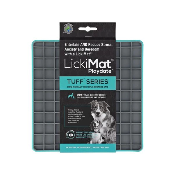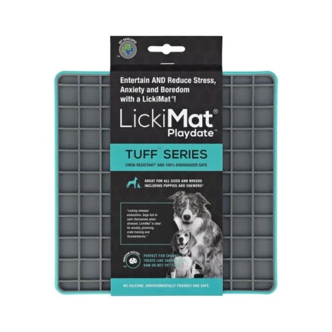 Lízacie podložky sú skvelým doplnkom, ktorý si váš maznáčik naozaj obľúbi. Typ Tuff Playdate je opatrená hrubším mriežkovým vzorom, je tak ideálny pre mokré krmivo, granule aj kúsky mäsa či mazľavé maškrty, uspokojí tiež väčšie plemená psov. Má hneď niekoľko výhod, medzi tie hlavné patrí spomalenie priebehu kŕmenia, zatraktívnenie príjmu krmiva a maškŕt, čistenie jazyka, zahnanie nudy a stresu a v neposlednom rade tiež príjemná zábava. LickiMat je zabijak nudy a všednosti. Tuff Playdate má oproti bežným podložkám Lickimat zosilnenú a tuhšiu konštrukcii z kombinácie gumy a plastu. Je teda vhodnejšia pre šteňatá s ostrými zúbkami alebo psy, u ktorých hrozí, že budú chcieť do podložky hrýzť.