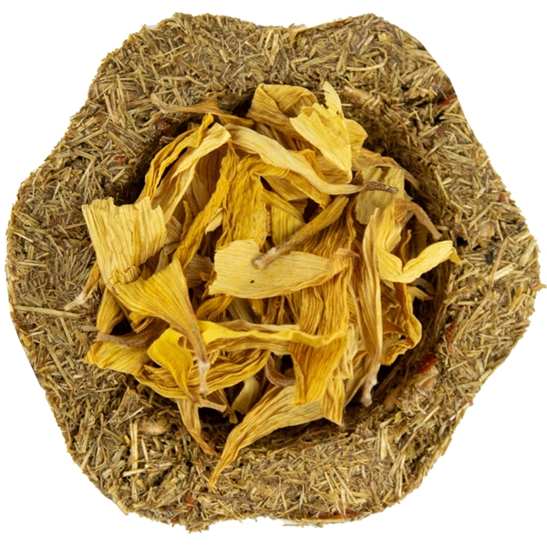 Sušené lúčne traviny, borák, škrob, trávne semená (mätonoh, kostrava, borák, ďatelina), pestrec, byliny (skorocel, harmanček, slnečnicové listy) a sušená mrkva.