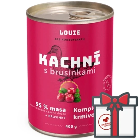 Doprajte svojmu psovi epickú a prirodzenú žranicu, po ktorej jeho bruško túži. Šťavnatá konzerva pre psov Louie kačica s brusnicami je vhodná pre psy všetkých plemien bez ohľadu na vek. Kompletná receptúra krmiva Louie dokonale napodobňuje čerstvo ulovenú korisť vo voľnej prírode. 95 % mletého kačacieho mäsa je zdokonalené zmesou rastlinných zložiek, ktoré nahrádzajú obsah žalúdka uloveného bylinožravca a podporujú peristaltiku čriev, pridanými vitamínmi a minerálmi spolu s mäkčenými kačacími kosťami, ktoré sú prirodzeným zdrojom vápnika a fosforu v prirodzenom pomere.