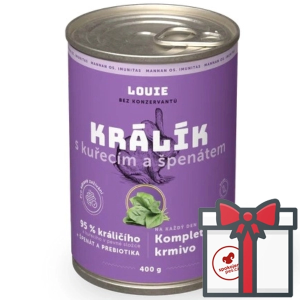 Doprajte svojmu psovi pominuteľnú a prirodzenú baštu, po ktorej jeho bruško túži. Konzerva pre psov Louie králik s kuracím a so špenátom je vhodná pre psy všetkých plemien bez ohľadu na vek. Kompletné receptúry krmiva Louie dokonale napodobňujú čerstvo ulovenú korisť vo voľnej prírode. 95 % mletého mäsa je zdokonalené zmesou rastlinných zložiek, ktoré nahrádzajú obsah žalúdka uloveného bylinožravca a podporujú peristaltiku čriev, pridanými vitamínmi a minerálmi spolu s mäkčenými králičími kosťami, ktoré sú prirodzeným zdrojom vápnika a fosforu v prirodzenom pomere.