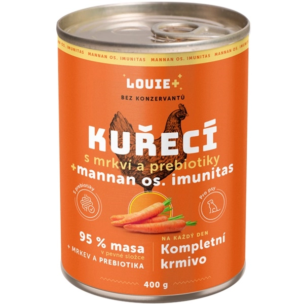 Doprajte svojmu domácemu miláčikovi poctivú a prírodnú baštu plnú šťavnatého mäsa. Kompletné krmivo pre psov Louie z Mannan os. Imunitas obsahuje zdraviu prospešnú rastlinnú vlákninu vo forme manánových oligosacharidov (MOS) a fruktooligosacharidov (FOS), ktoré prispievajú k normálnej funkcii tráviaceho a imunitného systému. Chutná a nutrične bohatá mrkva s vysokým obsahom vlákniny podporí zdravú peristaltiku čriev a pomôže udržať zdravie močových ciest.