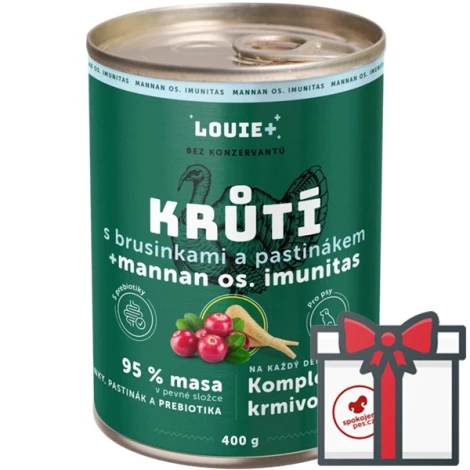Kompletné a poctivé krmivo pre psy všetkých plemien bez ohľadu na vek. Šťavnatá morčacia konzerva Louie s brusnicami, paštrnákom a prebiotikami poteší mlsné jazýčky, posilní črevnú mikroflóru a podporí imunitný systém. Úplne prírodné a s neobvykle vysokým obsahom mäsa. Výhodné balenie 4 konzerv + Louie vývaru 400 g ZADARMO!