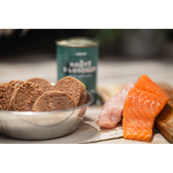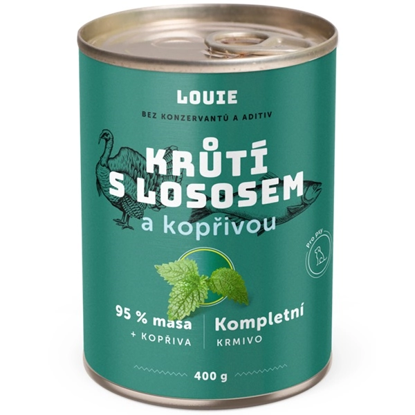 Doprajte svojmu psovi nezabudnuteľnú a prirodzenú žranicu, po ktorej jeho bruško túži. Šťavnatá morčacia konzerva Louie s lososom a žihľavou je vhodná pre psy všetkých plemien bez ohľadu na vek. Kompletné receptúry krmiva Louie dokonale napodobňujú čerstvo ulovenú korisť vo voľnej prírode. 95 % mletého morčacieho mäsa s lososom je zdokonalené zmesou rastlinných zložiek, ktoré nahrádzajú obsah žalúdka uloveného bylinožravca, pridanými vitamínmi a minerálmi spolu s mäkčenými morčacími a rybími kosťami, ktoré sú prirodzeným zdrojom vápnika a fosforu v prirodzenom pomere.