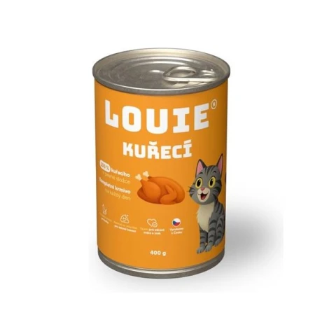 Kompletné krmivo pre mačky všetkých vekových kategórií a plemien. Konzerva pre mačky Louie Chicken s prebiotikami obsahuje 100 % pevného mäsa, ktoré mačku prenesie do divočiny s blaženým pocitom práve ulovenej koristi. Úplne prírodné, bez dochucovadiel a farbív.
