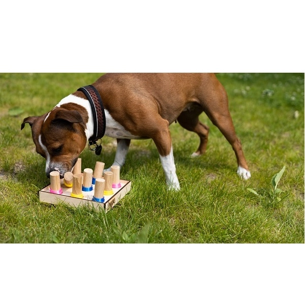Hlavolam je niečo ako krížovka pre psov, precvičuje mozog a trochu zrelaxuje. Táto hádanka je jedinečná svojimi možnosťami. Viacero možností na ukrytie pochúťok zabezpečí, že vášho chlpatého kamoša tento hlavolam nikdy neomrzí. Brezová preglejka je odolná a figúrky sú vyrobené z bukového dreva spolu so základňami vytlačenými na 3D tlačiarni z ekologického filamentu. Prepojenie zdvíhacích figúrok a posuvných kameňov zabezpečí zábavu pre všetkých chlpatých kamošov. Súčasťou balenia je aj praktický látkový obal s dvoma vreckami. Jeden pre základňu a jeden pre figúrky.