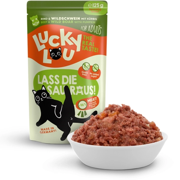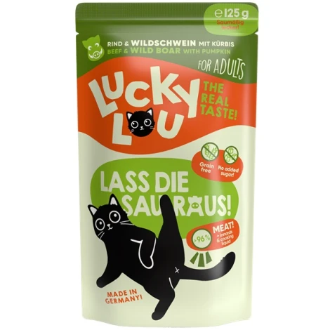 Kompletné krmivo s hovädzím a diviačím mäsom pre skutočných mäsožravcov. Ľahko stráviteľné zloženie kapsičiek Lucky Lou Lifestage odráža prirodzené potreby dospelých mačiek. Obsahuje veľa mäsa, vnútorností a vývaru, aby sa čo najviac podobalo ich prirodzenej strave. Tekvica obsahuje vlákninu, ktorá napomáha správnemu tráveniu, a vitamín A, ktorý prospieva koži a srsti. Pupalkový olej zase vďaka omega-3 mastným kyselinám zabraňuje zápalom a podporí zdravú srsť, kožu a celkové zdravie vašej mačky.