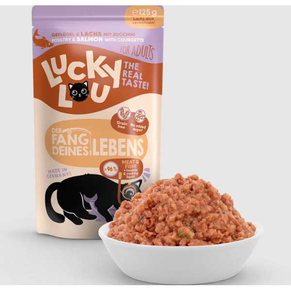 Bohatá a poctivá kapsička pre dospelé mačky s hydinovým mäsom a lososom, cuketou a lososovým olejom. Ľahko stráviteľná Lucky Lou Lifestage vyniká vysokým obsahom mäsa, vnútorností a vývaru, čo dokonale odráža prirodzené potreby skutočných mäsožravcov.