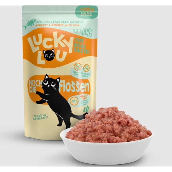 Bohatá a poctivá kapsička pre dospelé mačky s hydinovým mäsom a pstruhom, hruškou a lososovým olejom. Ľahko stráviteľná Lucky Lou Lifestage vyniká vysokým obsahom mäsa, vnútorností a vývaru, čo dokonale odráža potreby skutočných mäsožravcov.