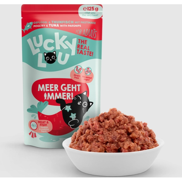Bohatá a poctivá kapsička pre dospelé mačky s hydinovým mäsom a tuniakom, paštétou a lososovým olejom. Ľahko stráviteľná Lucky Lou Lifestage vyniká vysokým obsahom mäsa, vnútorností a vývaru, čo dokonale odráža potreby skutočných mäsožravcov.
