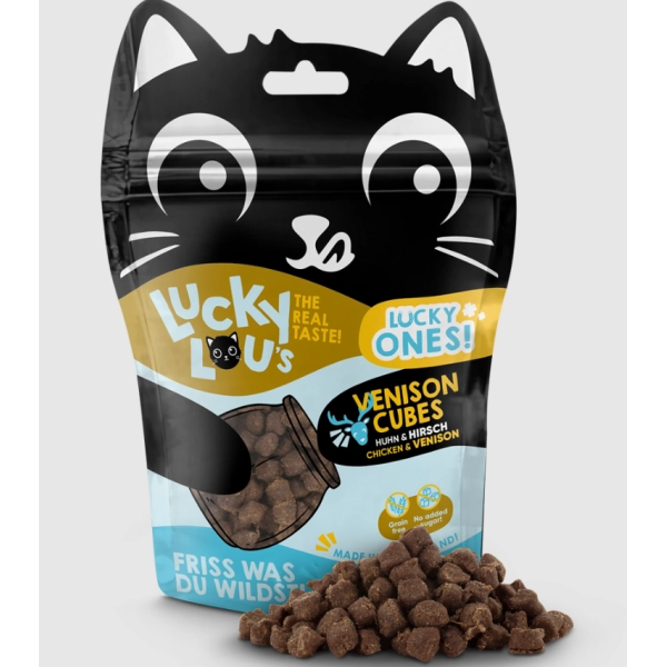 Maškrty Lucky Lou Lucky Ones s kuracím mäsom a jeleňom sa môžu pochváliť skvelou vôňou, výbornou chuťou a úžasnou schopnosťou zabaviť vašu mačku počas dlhých večerov. Zdravá pochúťka bez obilnín a pridaného cukru je ideálna na časté odmeňovanie alebo schovávanie do rôznych hračiek. Vhodné pre mačky všetkých vekových kategórií.