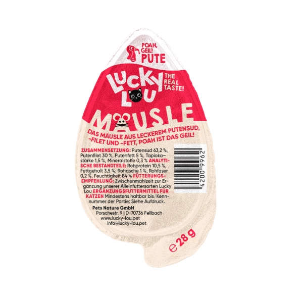 Tentoraz chutná myš neunikne. Potešte svoju mačičku dôvtipnou pochúťkou Lucky Lou Mäusle, ktorá skvele vyzerá a ešte lepšie chutí. Šťavnatá a ľahko stráviteľná pochúťka z morčacieho mäsa podnieti fantáziu vašej mačky a oživí jej jedálniček. Vhodné pre mačky všetkých vekových kategórií.