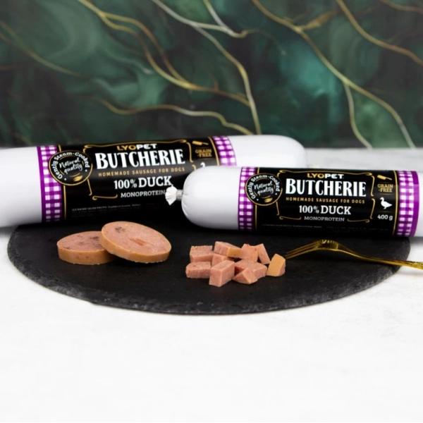 Kúsok pravého mäsa pre prípady, keď chcete svojmu psovi dopriať niečo extra. Saláma Lyopet Butcherie Duck je plná poctivého mäsa, omamnej vône a lahodnej chuti, ktorá láka z druhej miestnosti. Ľahko stráviteľný snack s vysokým obsahom bielkovín.
