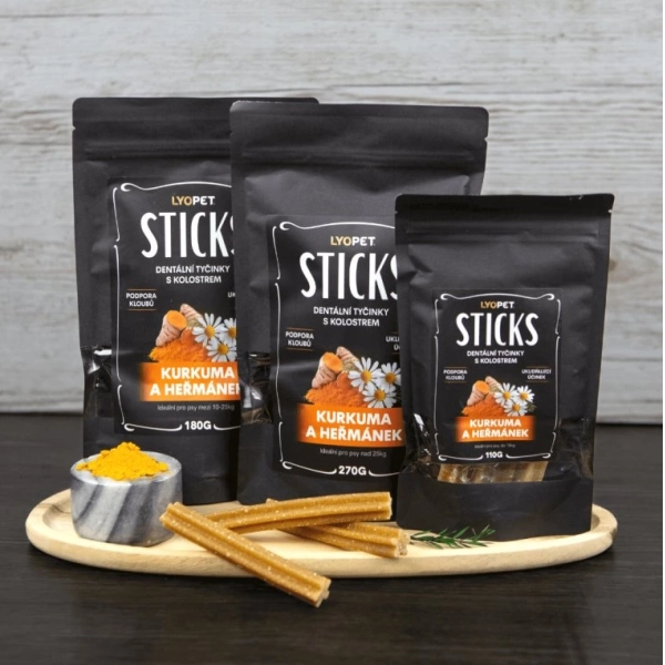 Pre zdravé zuby a svieži dych vyskúšajte hypoalergénne dentálne tyčinky s kurkumou a harmančekom Lyopet Dental Sticks Turmeric & Camomille Maxi. Lahodná prírodná odmena pre veľké psy, ktorá bojuje proti zubnému povlaku a zabraňuje tvorbe zubného kameňa. Výhodné balenie 3+1 ZADARMO!