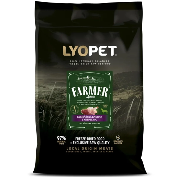 Kompletné superprémiové krmivo bez obilnín s kačicou a prepelicou, obalené lyofilizovaným mäsom pre ešte lepšiu chuť. Lyopet Farmer Adult Duck & Quail sa môže pochváliť vysokým obsahom čerstvého mäsa z wellfare fariem, množstvom superpotravín a prírodných zložiek.