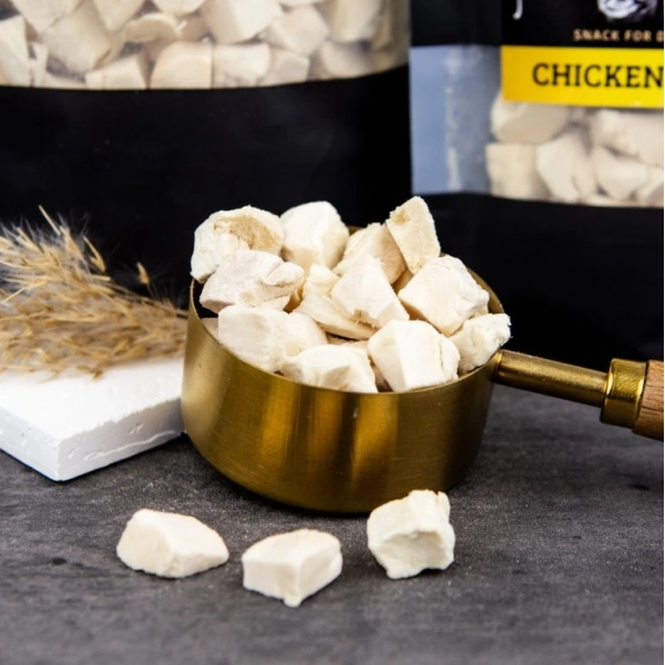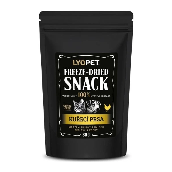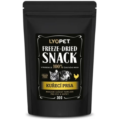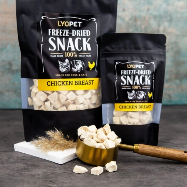 Lyopet Freeze-Dried Snack Chicken Breast pre psy a mačky je jednou z najzdravších vecí, ktoré môžete svojim domácim miláčikom ponúknuť. Šetrné sušenie mrazom zachováva všetky nutričné hodnoty mäsa, ako aj pôvodnú nezameniteľnú chuť a vôňu. Prirodzená a zdravá možnosť odmeny, vhodná na výcvik alebo len tak pre zábavu, pretože spokojný pohľad stojí za to.