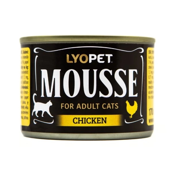 Kurací mousse pre mačky všetkých vekových kategórií Lyopet Mousse Cat Chicken. Jemne našľahané kúsky mäsa z kvalitného kurčaťa doprajú mačke gurmánsky zážitok, ktorý baví, chutí a zároveň prospieva jej zdraviu. Výživné krmivo so 100 % prírodným zložením je určené na každodenné kŕmenie aj ako odmena pri výnimočných chvíľach.