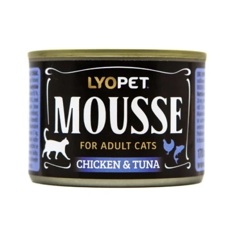 Kurací a tuniakový mousse pre mačky všetkých vekových kategórií Lyopet Mousse Cat Chicken & Tuna. Jemne našľahané kúsky mäsa z kvalitného tuniaka a kurčaťa doprajú mačke gurmánsky zážitok, ktorý baví, chutí a zároveň prospieva jej zdraviu. Výživné krmivo so 100 % prírodným zložením je vhodné na každodenné podávanie aj ako odmena pre výnimočné chvíle.