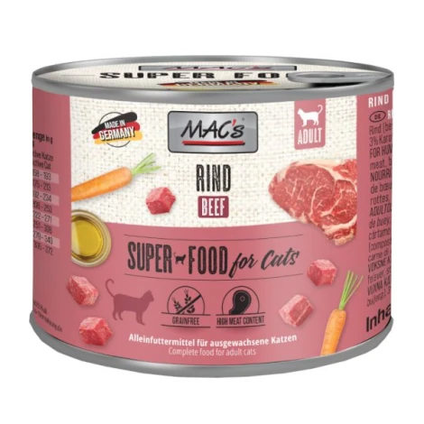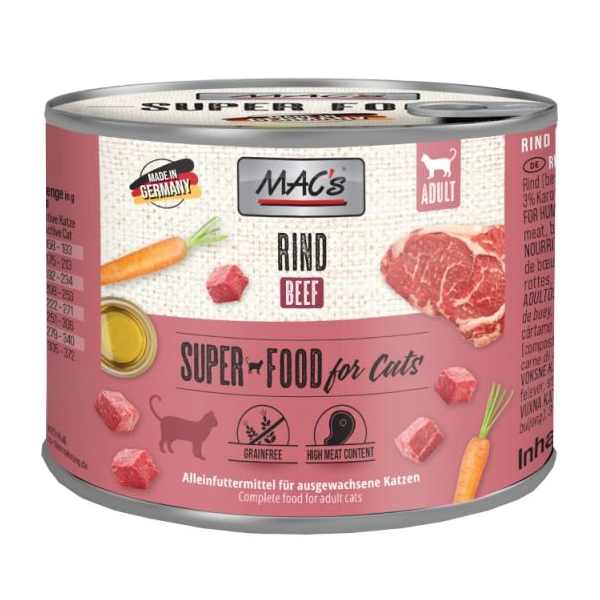 Mac's Cat konzerva hovädzie obsahuje 96 % hovädzieho mäsa a vnútorností, ktoré sú doplnené krehkú mrkvou a svetlicovým olejom. Mimoriadne chutná mäsová konzerva je vhodná aj pre citlivú, vyberavú mačku, alebo mačku s problematickým príjmom krmiva - pri chorobe, vysileniu, nechutenstvo, starobe a gravidity. Zloženie zahŕňa všetko potrebné pre zdravý a kvalitný život, navyše je obohatené o taurín a minerálne látky.