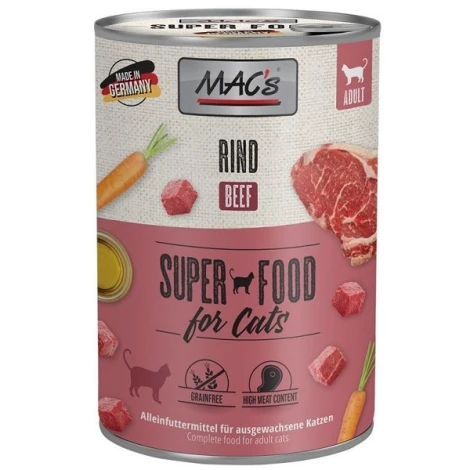 Mac's Cat konzerva hovädzie obsahuje 96 % hovädzieho mäsa a vnútorností, ktoré sú doplnené krehkú mrkvou a svetlicovým olejom. Mimoriadne chutná mäsová konzerva je vhodná aj pre citlivú, vyberavú mačku, alebo mačku s problematickým príjmom krmiva - pri chorobe, vysileniu, nechutenstvo, starobe a gravidity. Zloženie zahŕňa všetko potrebné pre zdravý a kvalitný život, navyše je obohatené o taurín a minerálne látky.