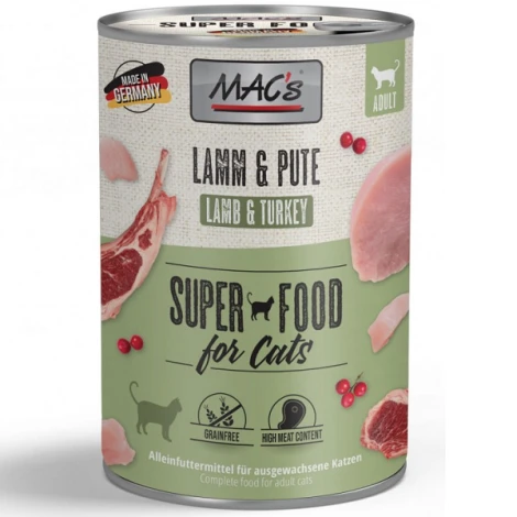 Konzerva pre mačky Mac's Cat obsahuje 96 % jahňacieho a morčacieho mäsa a vnútorností, ktoré sú doplnené brusnicami a konopným olejom. Vhodná aj pre citlivú, vyberavú a maškrtnú mačku.