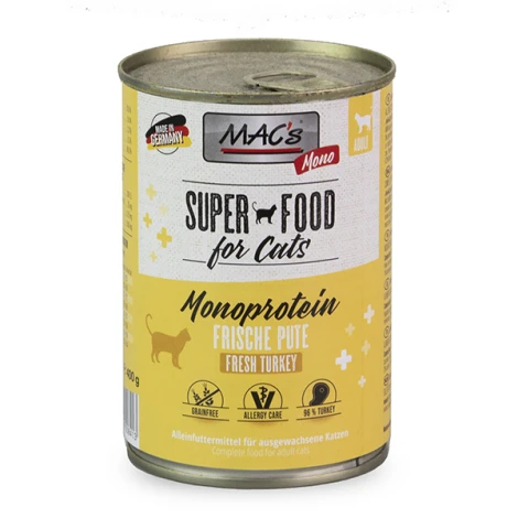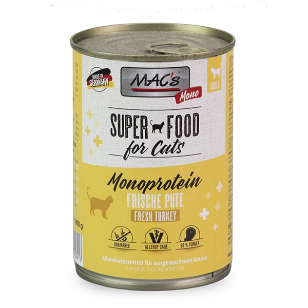 Jednoproteínové konzerva pre mačky Mac's Cat Mono - jediným živočíšnym zdrojom proteínu je čisté mäso z morky. Pre špeciálne potreby mačky s alergiou alebo precitlivenosťou na niektoré mäsa.