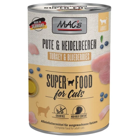 Konzerva pre mačky Mac's obsahuje 96 % morčacieho a hovädzieho mäsa a vnútorností, ktoré sú doplnené čučoriedkami a svetlicovým olejom. Vhodná aj pre citlivú, vyberavú a maškrtnú mačku.